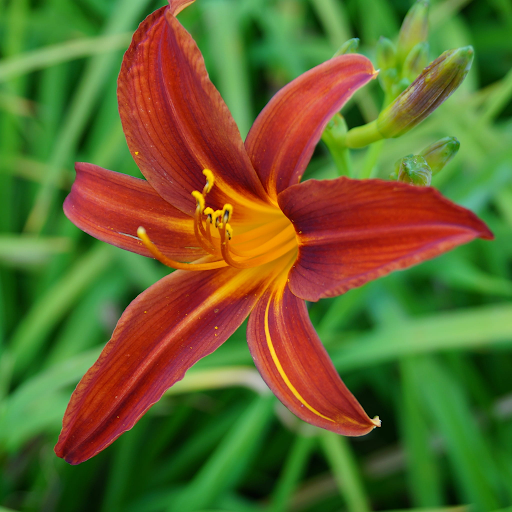 Die Taglilie ‘Sammy Russell’ bildet dichte Horste aus langen, schmalen, grasartigen Blättern. Aus diesen wachsen kräftige Blütenstiele, die zahlreiche Knospen tragen.