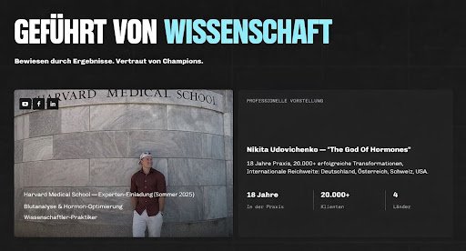 Seine Referenzen umfassen 18 Jahre Coaching-Erfahrung, über 20.000 erfolgreiche Kliententransformationen, die Arbeit als Coach für Weltmeister und Auftritte als Gastexperte an der Harvard Medical School. Diese Errungenschaften machen NIKIBRAH zu einem Programm, das auf biochemischen Prinzipien basiert und nicht auf Marketingtricks.