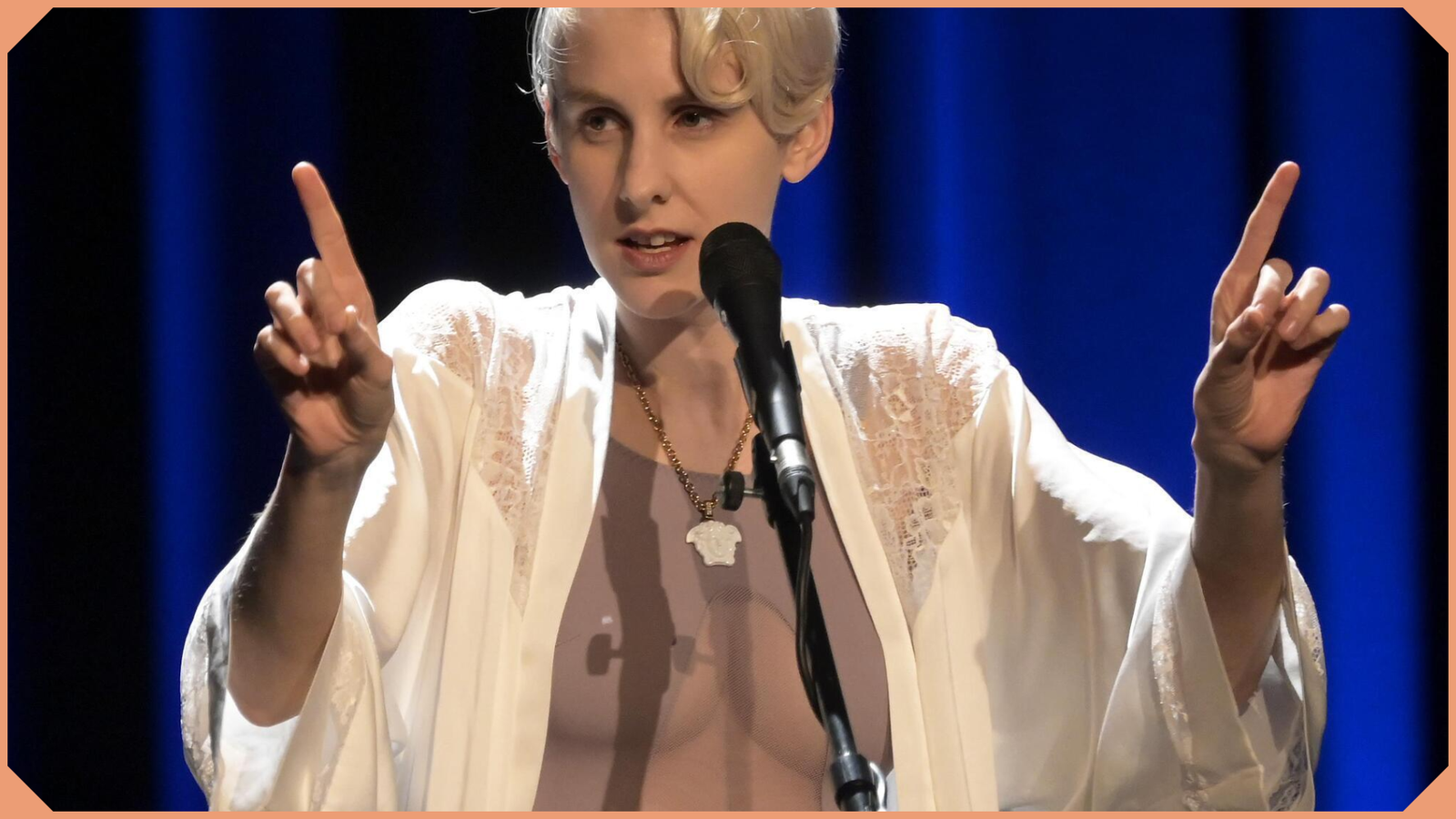 Ihre Auftritte sind geprägt von einer Mischung aus Ironie, Provokation und intellektueller Satire. Sie arbeitet mit Sprache auf eine sehr präzise Weise und nutzt bewusst starke Bilder, um gesellschaftliche Themen zu kommentieren.